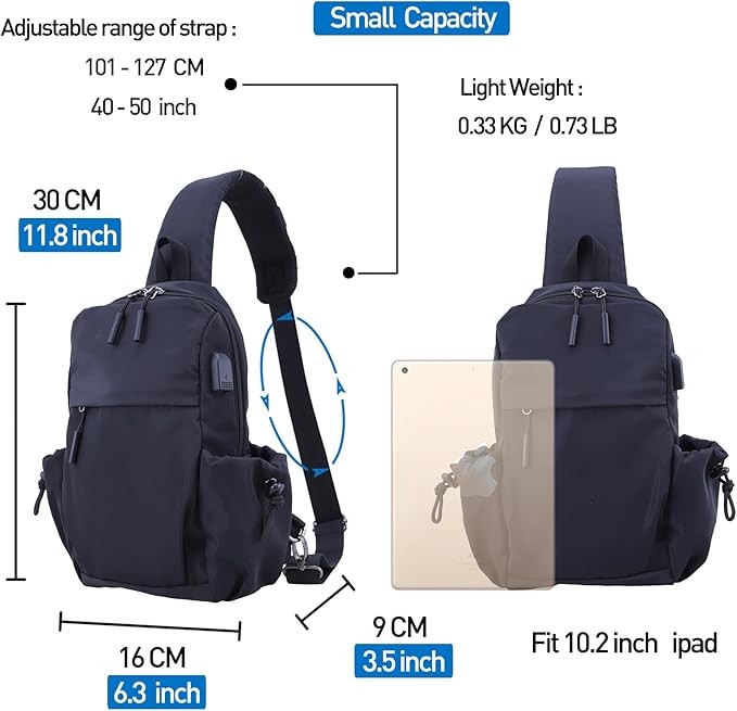 Lightweight & Waterproof: shoulder bag for men women is made of high quality nylon waterproof material. excellent workmanship which shows your outstanding temperament. lightweight shoulder bag for women men sits nicely on your back/chest and isn't to chunky or clunky on body frame. if over shoulder bag for women men gets dirty you could just wipe it off and it stays clean Durable & Breathable design: crossbody bag for men women with breathable mesh and padded strap design which doesn't make you sweat,breathable crossbody bag for women men with external usb charging port and reversing zipper strip is convenience and safe to travel outside (power bank not included). satchel strap of men & women sling shoulder bag is adjustable for as tight or loose, to hang as high or low as you want. Multi-occasion: sling pack bag for women & men is perfect for multi-occasion. sling backpack bag for hiking walking biking cycling hunting travel school business gym camping beach and everyday using. perfectly works as sling shoulder pack bag, wear this black sling bag over either shoulder comfortably, or across the chest to deter thieves and keep your hands free. if buyer meet any problem with product, looking forward to ur message!! Show more