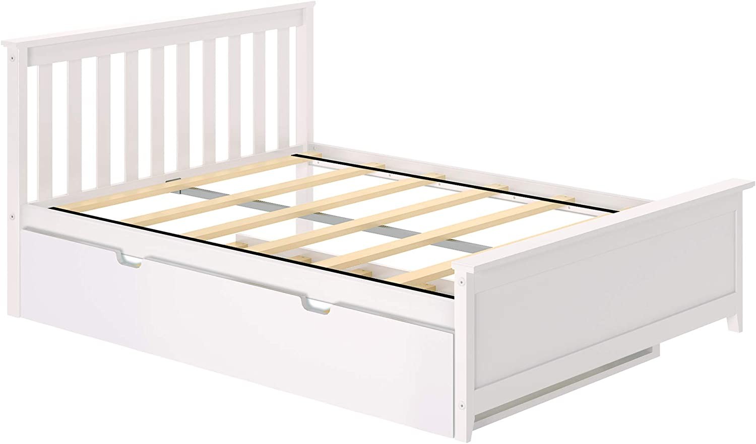 Including single bed size trunk + slats. Trundle fits standard double bed mattresses up to 20.32 cm thick. The ramps overlap the bed rails to prevent sliding under the bed.